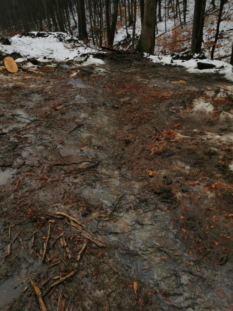 A fát rakodó vállalkozó munkagépei jelentős olajszennyezést hagytak maguk után, ami a természetfilmes szerint a most olvadó hólével együtt lefolyik a börzsönyi patakokba.